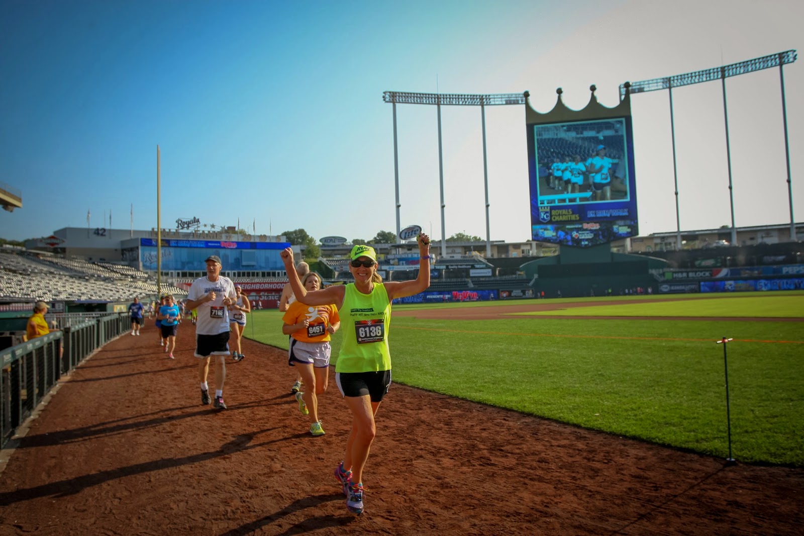 Such was the case last Saturday, when they had their annual 5k Charity Run on a beautiful, surprisingly cool morning. Hubby and I laced up and headed to Kauffman Stadium, arriving along side almost 2,000 other participants, with the opportunity of running around the warning track of the stadium, all for a good cause.